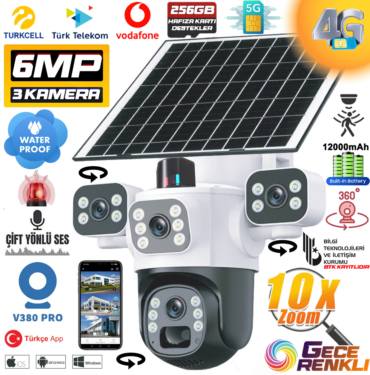 * 8W güneş paneli + 12000Mah şarj edilebilir pil;